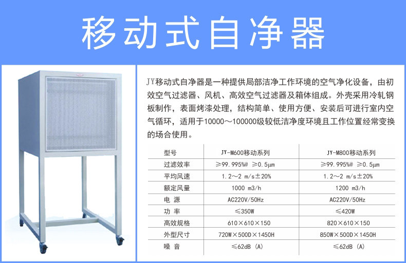 JY移動(dòng)式自凈器是一種提供局部潔凈工作環(huán)境的空氣凈化設(shè)備,由初效空氣過濾器、風(fēng)機(jī)、高效空氣過濾器及箱體組成。外殼采用冷軋鋼板制作,表面烤漆處理,結(jié)構(gòu)簡單、使用方便、安裝后可進(jìn)行室內(nèi)空氣循環(huán),適用于10000~100000級(jí)較低潔凈度環(huán)境且工作位置經(jīng)常變換的場(chǎng)合使用。